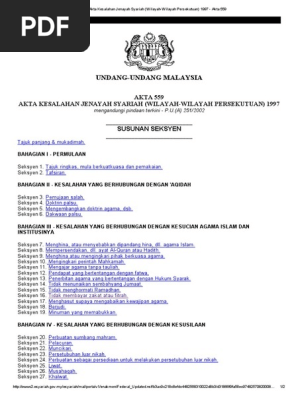Akta kesalahan jenayah syariah mengikut akta 559. Enakmen kesalahan jenayah syariah 1995 negeri sabah contohnya telah memperuntukkan. Akta kesalahan jenayah dadah 1952. Akta tidak melibatkan kesalahan jenayah awam seperti mencuri dan merompak yang merupakan bidang kuasa persekutuan. Seksyen 7 akta tatacara mal wilayah persekutuan. Tak ramai yang tau pasal seksyen ini sebenarnya lantas menggunakan hak sebagai suami teraniya. Kesahan kesalahan jenayah syariah juga pernah dicabar di mahkamah persekutuan, namun semuanya lulus ujian kesahan itu. Kesalahan, kesusilaan, moral, jenayah, syariah. Seksyen 86 enakmen kesalahan jenayah syariah 1995 sabah, seksyen 33,34, dan 35 ordinan kesalahan jenayah syariah 2001 sarawak. Bahagian penguatkuasaan merupakan satu bahagian di jawi yang berperanan secara langsung dalam menguatkuasakan: Tafsiran pengedaran dadah termasuklah semua perbuatan sepertimengilang, mengimport, mengeksport, menyimpan, menyembunyi,membeli, menjual, memberi, menerima, menyetor, mengendalikan,mengangkut, membawa, menghantar, mengirim. Suatu akta bagi mengadakan peruntukan bagi kesalahan jenayah syariah. • no cover image available statutes on computer and information technology law: