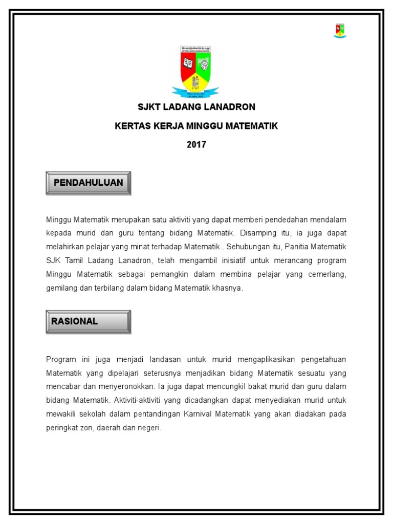 Kertas kerja 'minggu matematik' kertas kerja sempena minggu matematik 1. Savesave kertas kerja minggu matematik for later. Matematik merupakan subjek yang menarik pelbagai aktiviti yang boleh kita adakan sepanjang minggu tersebut seperti kuiz matematik, bijak sifir, persembahan dan banyak lagi. Kemudian menjelaskan materi yang disampaikan oleh guru kepada temannya 4. Kertas kerja didefinisikan sebagai makalah (artikel atau rencana) bertulis yang mengandungi makluman lengkap cadangan tertentu.