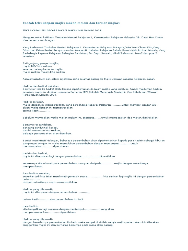 Contoh Teks Ucapan Majlis Makan Malam Dan Format Ringkas from imgv2-1-f.scribdassets.com Contoh teks pengacara majlis majlis perkahwinan adha & azwan. Search everywhere only in this topic. Sudilah tuan jamu selera, hidangan mesra pengikat kasih. Berikut ini rekomendasi menu makan malam sehat yang enak dan bergizi. Majlis dengan segala hormat mempersilakan. Bersyukur saya ke hadrat allah s.w.t kerana dengan limpah kurnianya dapatlah saya sekeluarga melaksanakan majlis perkahwinan anak saya.dengan pasangannya. Teks ucapan 1 teks ucapan pengerusi ansara teks ucapan oleh saudara saiful islam pengerusi ansara sempena majlis makan malam ansara 2017 di dewan mrsm gemencheh, negeri sembilan 15 april 2017. Bertamu rai sandakan, gendang gendut tali kecapi, sambil menonton.