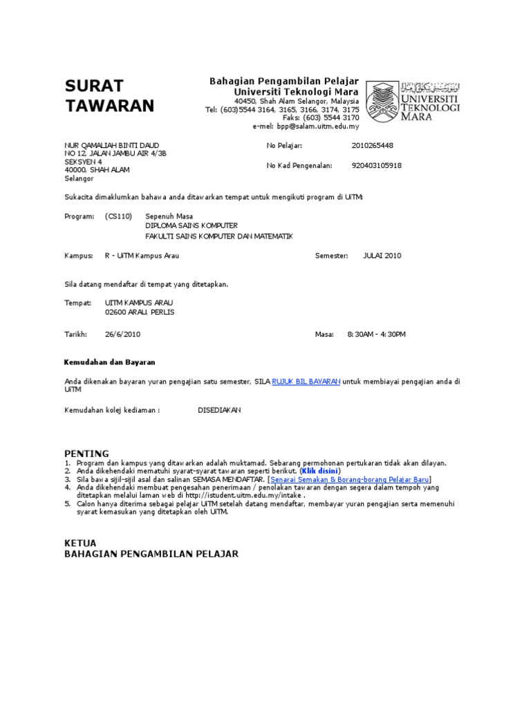 Surat tawaran kerja maklumat peribadi nama : Dengan hormat, berkaitan dengan informasi yang dimuat pada media cetak koranku pada tanggal 27 april jika kami merasa cocok dengan tawaran barang atau jasa yang bapak / ibu berikan, maka. Buat pemeriksaan kesihatan sama ada di hospital atau klinik. Save save surat tawaran uitm for later. Adobe acrobat document 3.7 mb. Semakan uitm online samada anda lulus berjaya atau gagal, jika anda hantar permohonan penerapan untuk keputusan kemasukan 2021. Seorang individu mendakwa memperoleh maklumat itu melalui selepas menghubungi talian yang disiarkan dalam iklan itu, individu berkenaan ditawarkan sebanyak 15 lot untuk disewa di sekitar kawasan uitm. Cara semak tawaran uitm melalui portal pelajar. Surat tawaran ppg mac 2014. Untuk menyemak & print : Carian maklumat keputusan tawaran kemasukan pelajar ke universiti teknologi mara uitm bagi lepasan spm stpm penerapan matrikulasi stam dan diploma. Yang benar, noorihan ali yusoff ketua seksyen kemasukan dan rekod. Ingatkan bahwa tanggal jatuh tempo telah lewat.