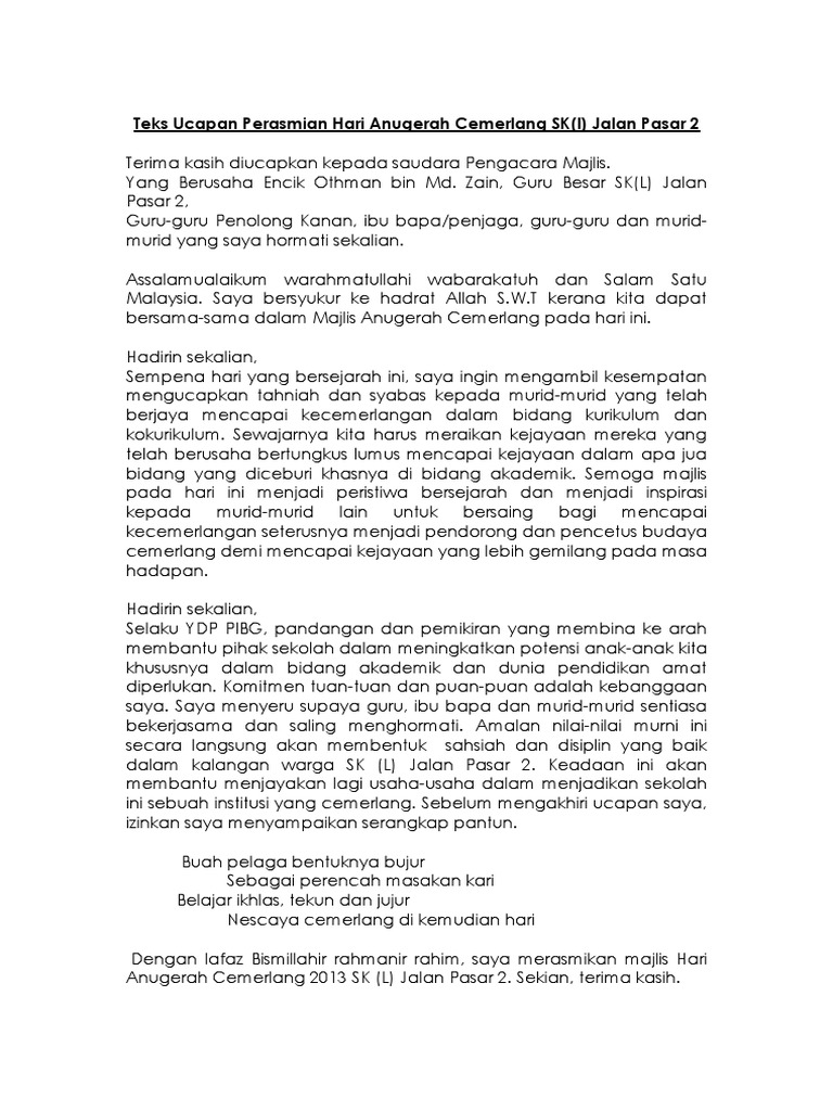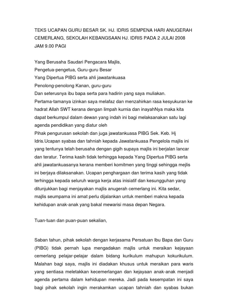 Pada hari guru, anda bisa memberikan surat atau ucapan selamat hari guru untuk pengajar pada topik kali ini akan membicarakan mengenai ucapan hari guru dalam bahasa inggris beserta (mendorongku untuk mencapai potensialku mengantarkanku pada bermimpi besar dan melakukan. Draf ucapan perasmian majlis anugerah cemerlang dan mesyuarat agung pibg smk cheras jaya tahun 2009. Sidang hadirin yang dihormati sekalian, kolah rupanya disangka perigi. Anugerah yang diberikan pada hari ini merupakan penghargaan pihak sekolah kepada para pelajar yang telah menunjukkan prestasi cemerlang dalam. Teks ucapan guru besar sk. Teks ucapan majlis anugerah kecemer. Ucapan pengerusi pibg sempena majlis anugerah cemerlang 2013. Teks pengacara majlis hari guru. Teks ucapan menteri besar hari guru 2019 pages 1 10 text version. Teks perasmian mesyuarat agung pibg. Sewaktu hendak menyiapkan teks pengacara majlis ini saya cuba juga membuat doa sempena hari guru pendidik2u. Idris pada 2 julai 2008 jam 9.00 pagi بِسْمِ. Majlis diteruskan dengan menjemput yang dihormati puan rosni binti gani, penolong kanan pentadbiran sk taman molek untuk menyampaikan ucapan.